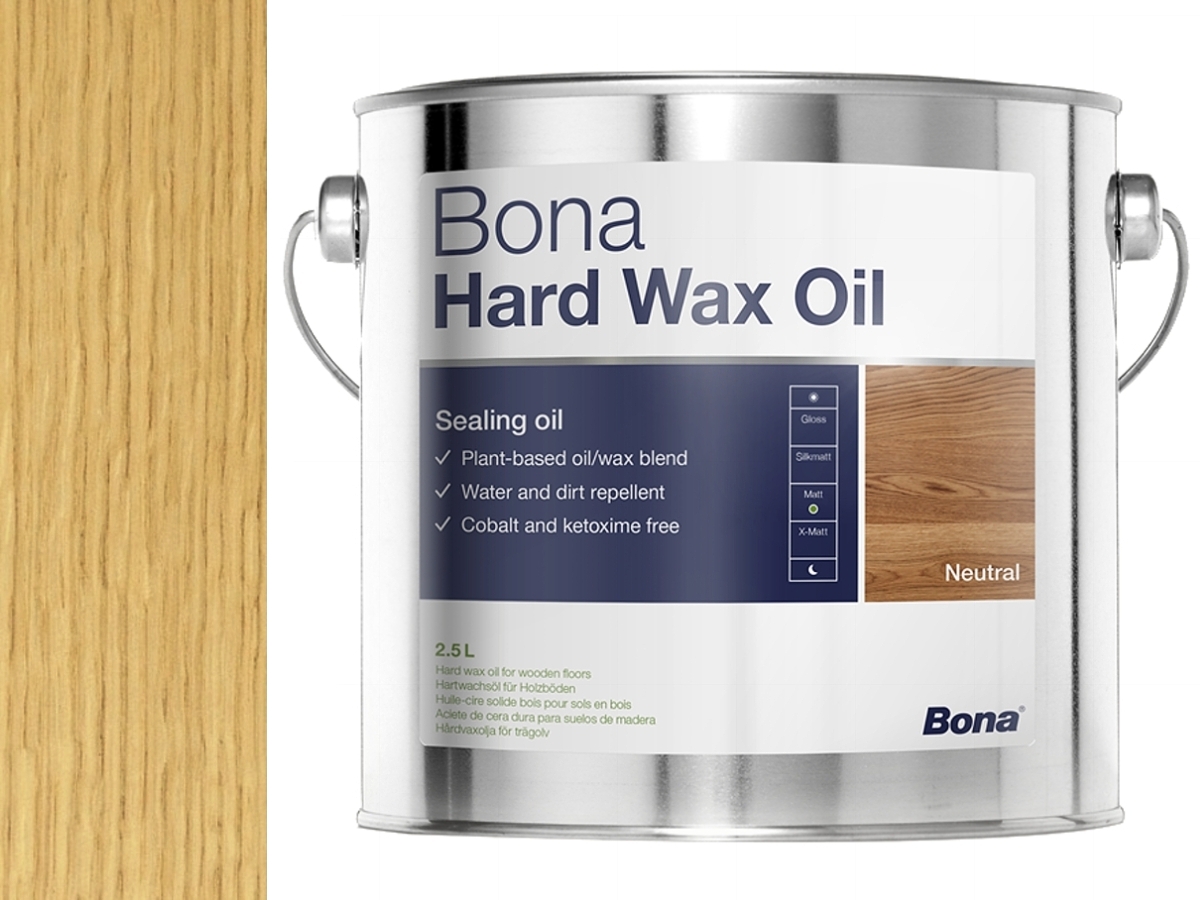 Bona Hard Wax Oil mat je přírodní směs olejů a vosků pro dřevěné podlahy v interiéru. Vytváří matný, příjemně přírodní vzhled s vysokou odolností proti vodě, skvrnám a mechanickému opotřebení. Povrch lze lokálně opravovat bez broušení a je snadný na údržbu. Olej je vhodný pro podlahové vytápění a splňuje EN 71-3 pro dětské hračky i kuchyňské plochy.