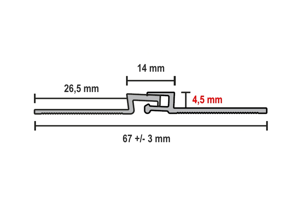 **Dvoudílné** hliníkové provedení s **patentovanou bezúdržbovou pohybovou spárou** kompenzuje dilatace **±2,5 mm** na obě strany, pokud je základna osazena do **označené nulové polohy**. Šířka spáry až **14 mm**. Před montáží zkontrolujte správné usazení – jinak profil nebude fungovat správně.