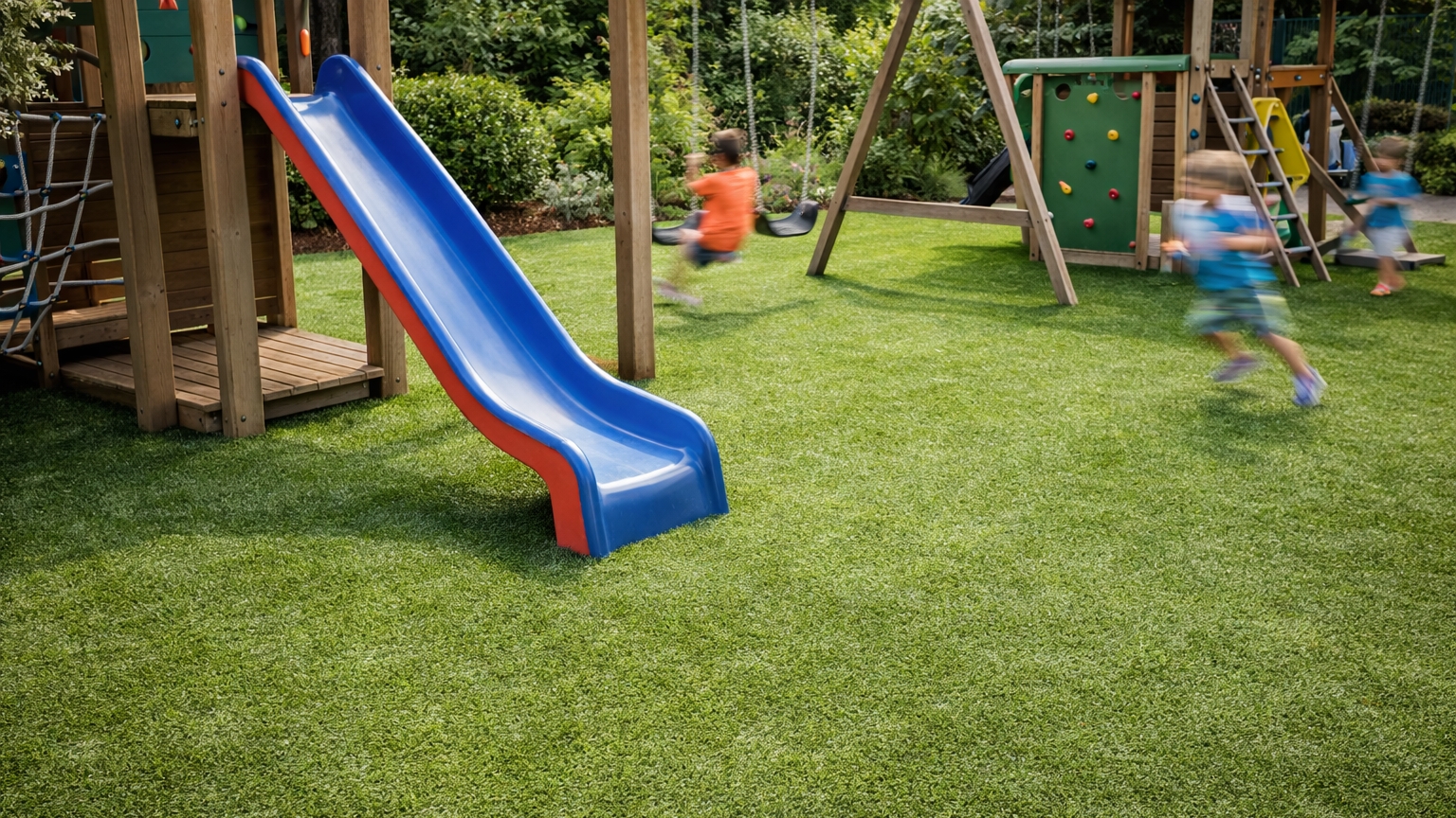 Na hřištích a herních plochách je prioritou bezpečnost a schopnost tlumit nárazy. Samotný umělý trávník však pád neřeší – klíčová je skladba pod ním.