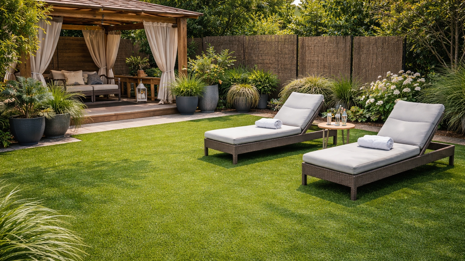 V okolí bazénů je hlavním požadavkem rychlý odvod vody, stabilita povrchu a bezpečný došlap. Umělý trávník zde slouží jako komfortní a neklouzavý povrch.