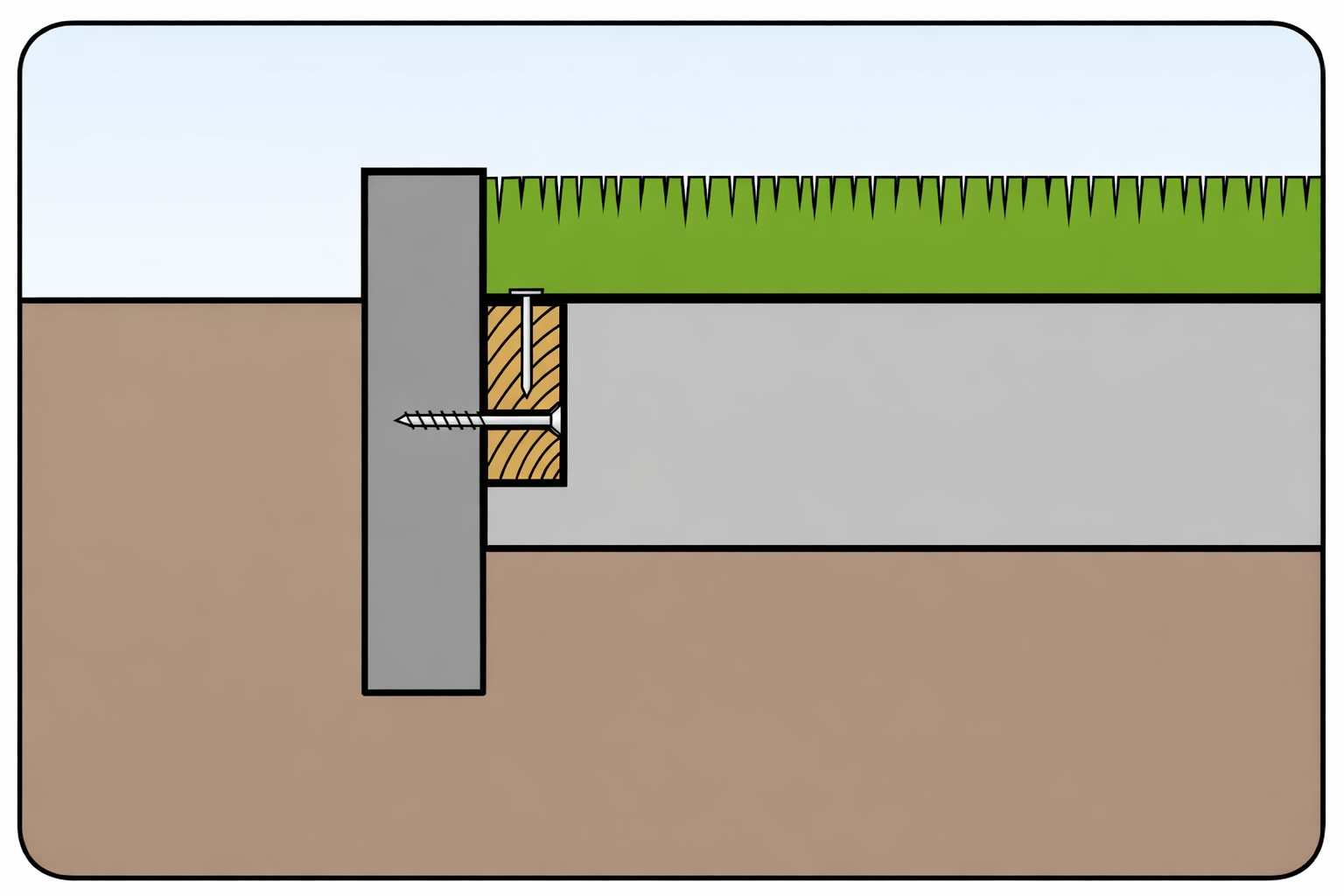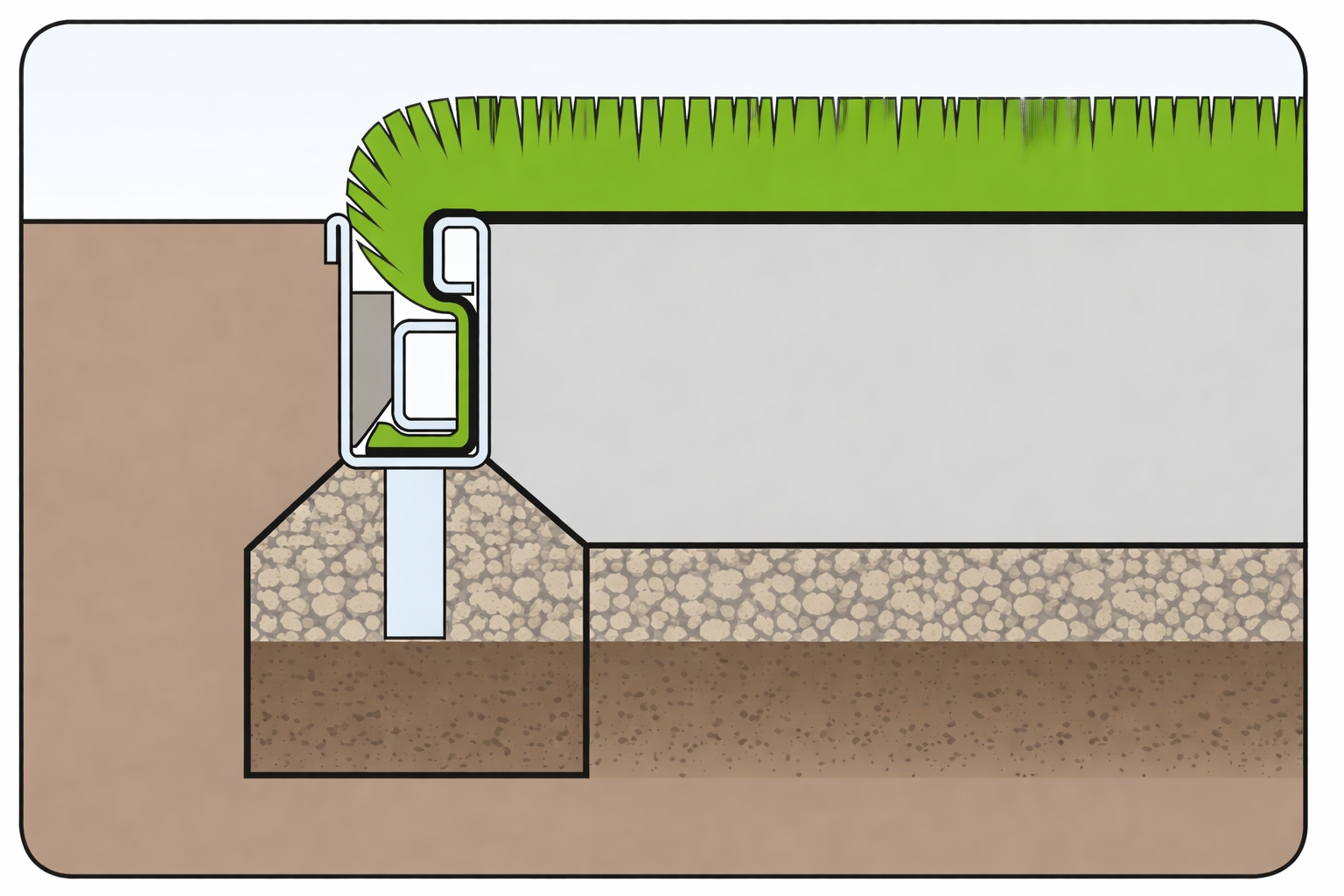 Fixace okrajů trávníku přítlačnou lištou ukotvenou do pevné plochy.Používá se především: