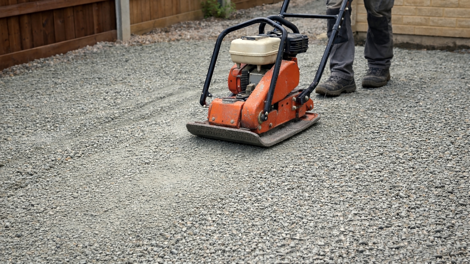 Poslední vrstva z kamenného prachu se stáhne do roviny a lehce zavibruje.
