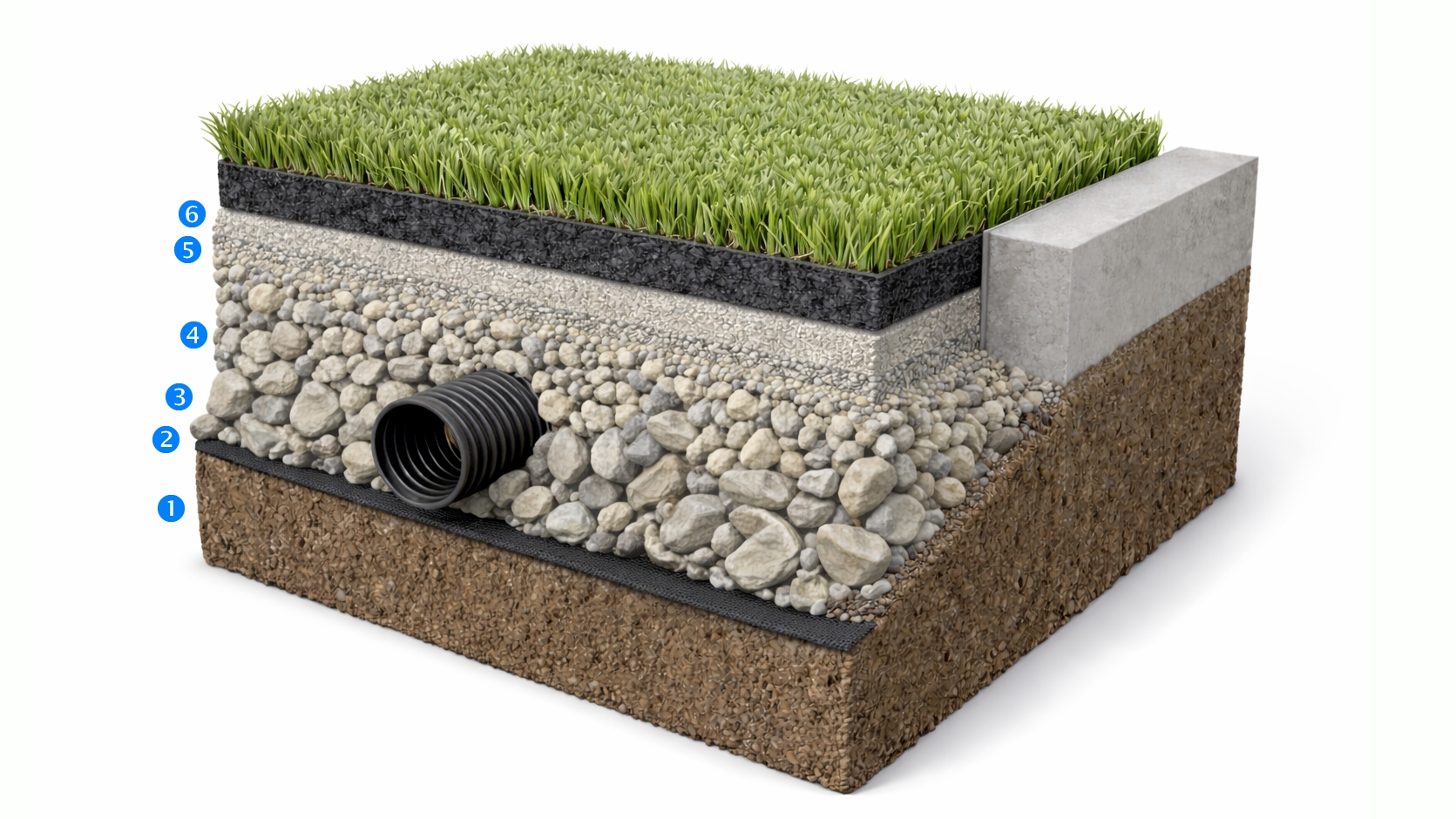 Skladba podloží pro umělý trávník (okrasné a pobytové plochy)