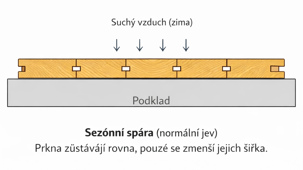 Sezónní spára u dřevěné podlahy – prkna zůstávají rovná, mění se pouze jejich šířka3. Kolik může podlaha reálně pracovat?
