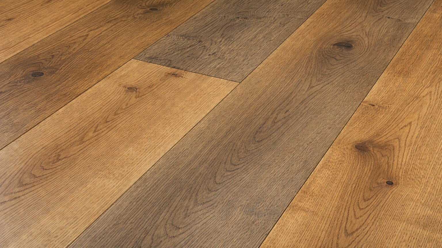 Lehce čpavkovaný dub s přirozenou reakcí tříslovin na čpavkové páry. Jednotlivá prkna reagují rozdílně – některá mají teplejší hnědý tón, jiná přecházejí do šedo-hněda. Kresba dřeva zůstává jasně čitelná a barva působí jako změna ve struktuře materiálu, nikoli jako povrchový nátěr.