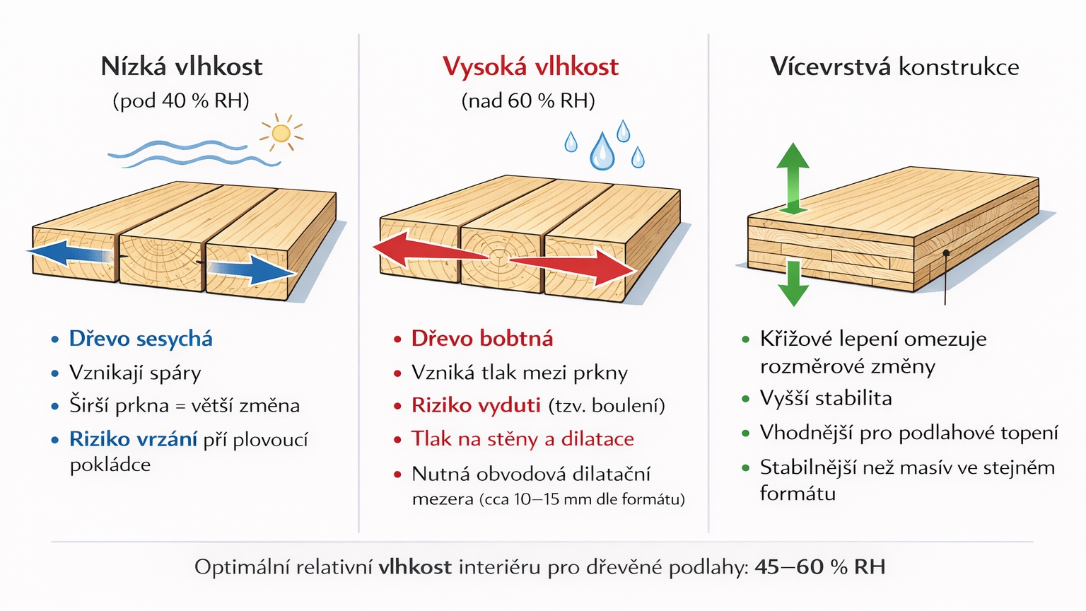 Stabilní interiérové klima (40–60 % RH). Bez něj bude pracovat jak masiv, tak vícevrstva.