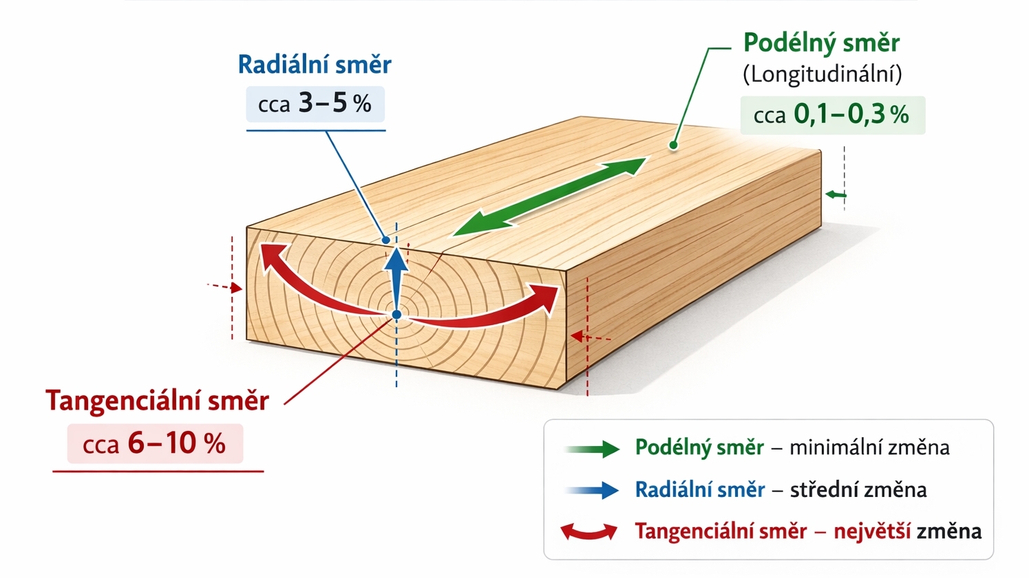 Tangenciální smrštění je přibližně dvojnásobné oproti radiálnímu.