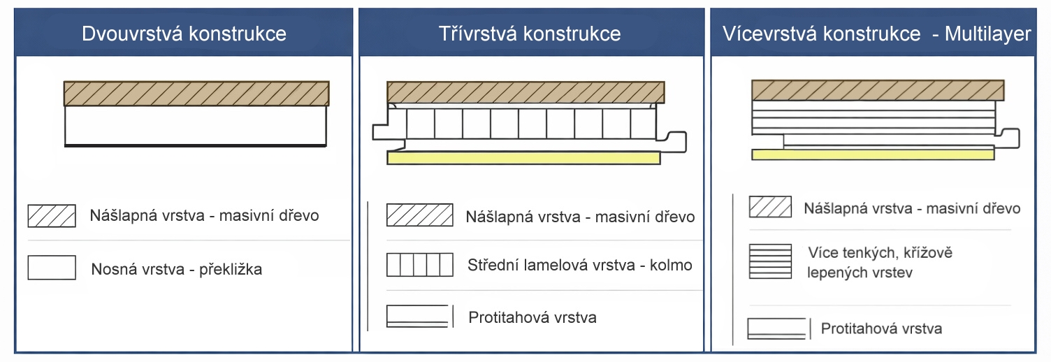 - Třívrstvé dřevěné podlahy – křížové vrstvy pro vyšší stabilitu, často i zámkový systém pro plovoucí pokládku.
