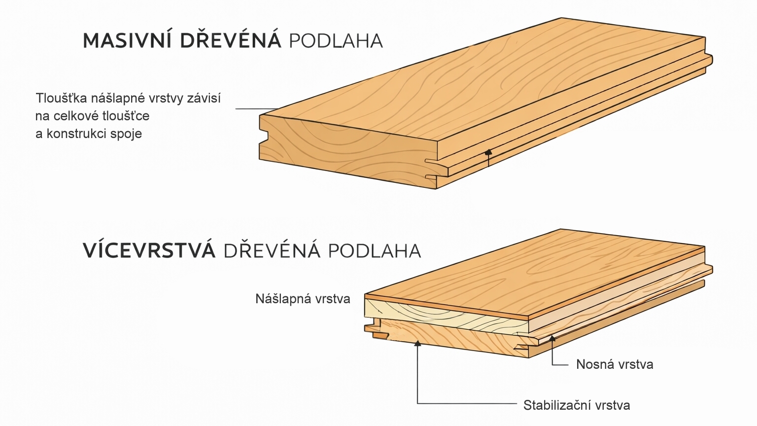 - Dvouvrstvé dřevěné podlahy – nášlap + stabilní nosná vrstva (typicky překližka), velmi dobrá stabilita, vhodné i pro podlahové topení.