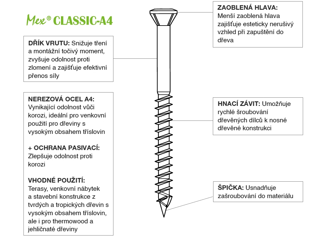Vruty Mex Classic A4 jsou vyrobeny z austenitické nerezové oceli A4, doplněné o pasivaci, která zvyšuje odolnost proti korozi v prostředí se slaností nebo tříslovinami v dřevu. Vhodné pro venkovní použití, terasy a konstrukce vystavené dešti, UV a změnám teplot.