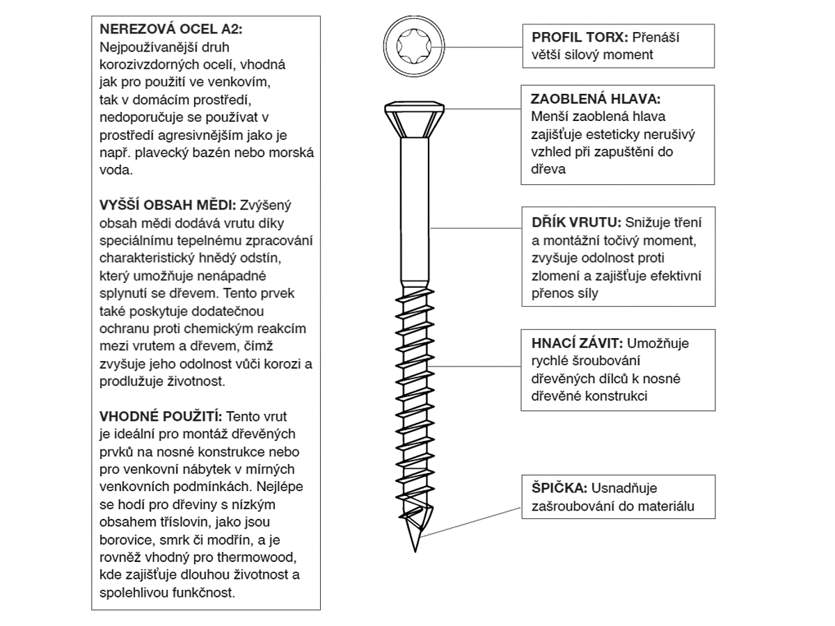 Profil Torx TX25, zaoblená estetická hlava a optimalizovaný tvar závitu umožňují rychlé šroubování s menším odporem a výrazně nižším rizikem stržení hlavy. Pro montáž tvrdších dřevin se doporučuje předvrtání.