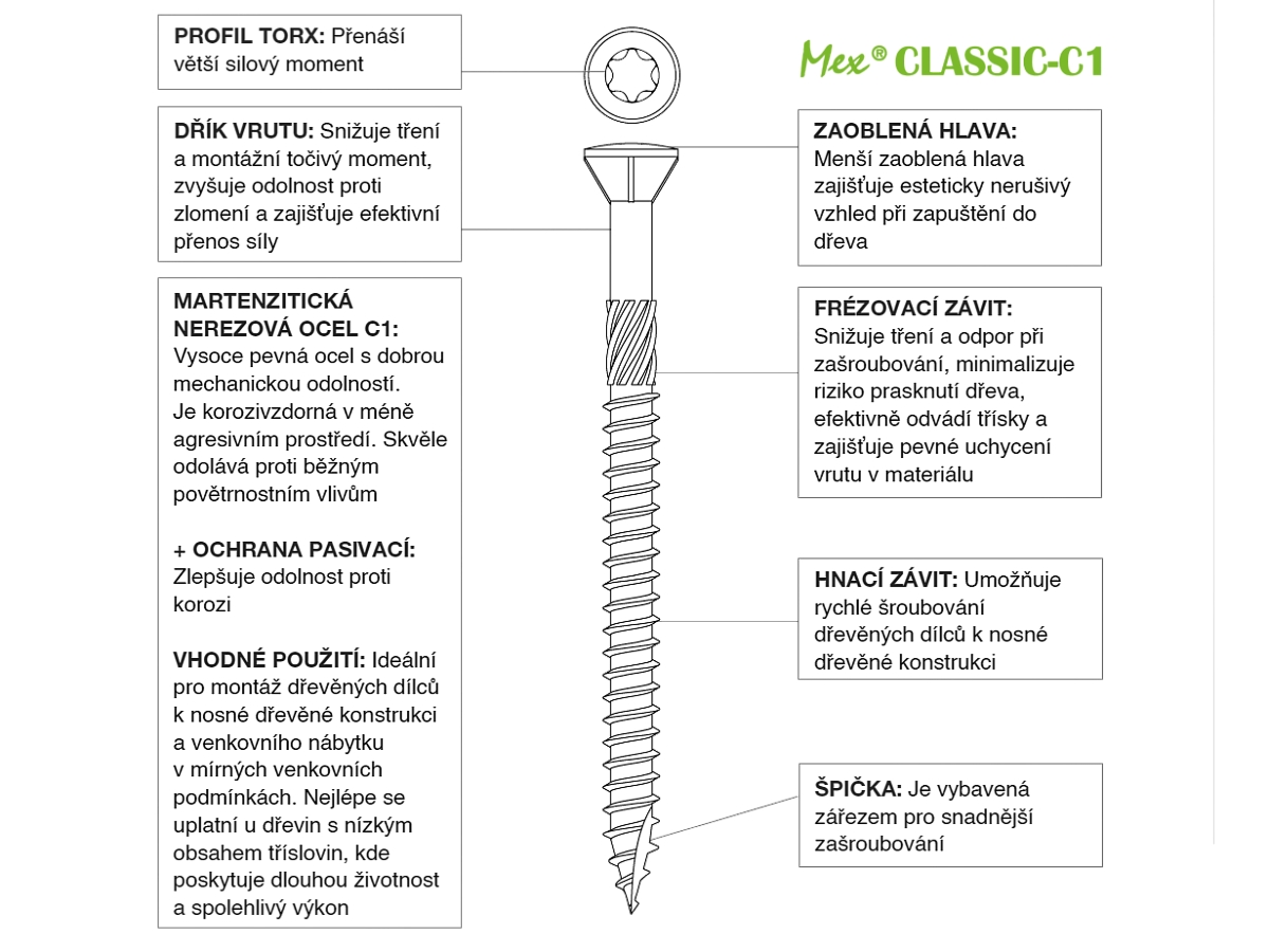 Vrut Mex Classic C1 5×60 mm patří mezi vysoce pevné martenzitické nerezové vruty určené pro spojování dřevěných prvků v běžných venkovních podmínkách. Díky materiálu C1 nabízí výrazně vyšší mechanickou pevnost a točivou odolnost, což je ideální zejména pro jehličnaté dřeviny a konstrukční spoje.