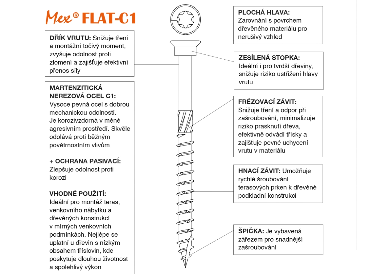 Vrut Mex Flat C1, 5×50 mm je terasový spojovací prvek určený pro upevnění dřevěných dílců k podkladní konstrukci. Konstrukce z martenzitické nerezové oceli C1 (1.4006) poskytuje vyšší mechanickou pevnost, stabilitu při šroubování a výrazně vyšší točivý moment – ideální pro projekty, kde je potřeba pevné a spolehlivé spojení.