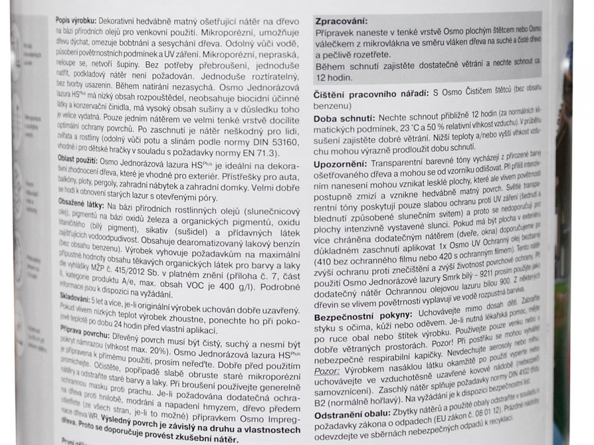 Světlé transparentní odstíny poskytují pouze slabší ochranu proti UV záření. Na exponované plochy doporučujeme následný nátěr Osmo UV ochranným olejem 420. Barevný odstín se může lišit dle přirozené barvy dřeva. Při příliš silné vrstvě mohou vzniknout lesklé mapy, které časem vyrovná povětrnost.