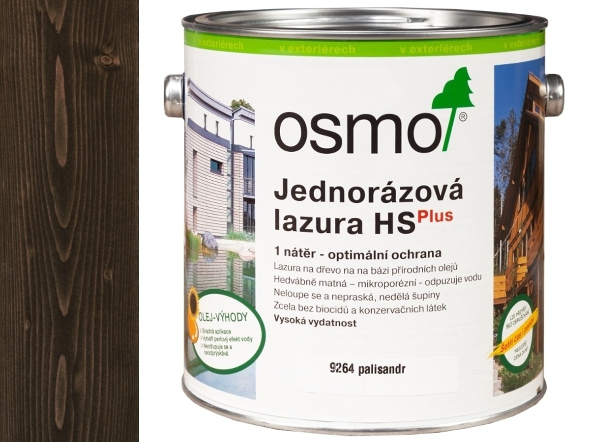 Jednorázová lazura OSMO 9264 Palisandr HS Plus představuje moderní ochranný nátěr na bázi přírodních olejů určený pro všechny venkovní dřevěné plochy. Lazura neobsahuje biocidní látky ani konzervanty, je ekologická a bezpečná. Díky extrémně vysoké vydatnosti a technologii HS Plus stačí pouze jeden velmi tenký nátěr, což výrazně zkracuje čas aplikace i celkovou spotřebu materiálu.