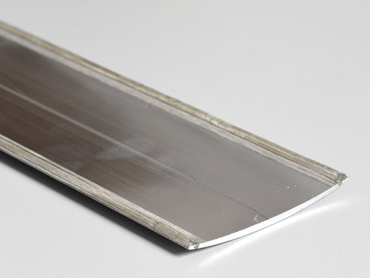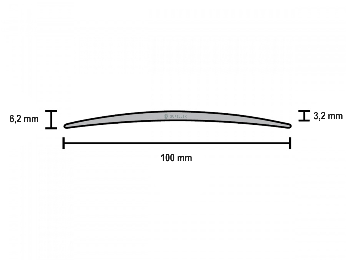 Extra široká samolepicí oblá přechodová lišta Profilteam – Inox E07 (eloxovaný hliník) pro přechody podlah ve stejné úrovni nebo s převýšením. Šířka 100 mm, délka 1000 mm, výška 6,2 mm, tloušťka 3,2 mm, max. převýšení 7 mm. Vhodná i jako prahová lišta. Zesílený střed profilu (3,2 mm) zabraňuje „propadnutí“ lišty přes širší spáry. Montáž bez vrtání na rovný, tvrdý, suchý, stabilní a odmaštěný podklad. Pružné kaučukové lepidlo z výroby.