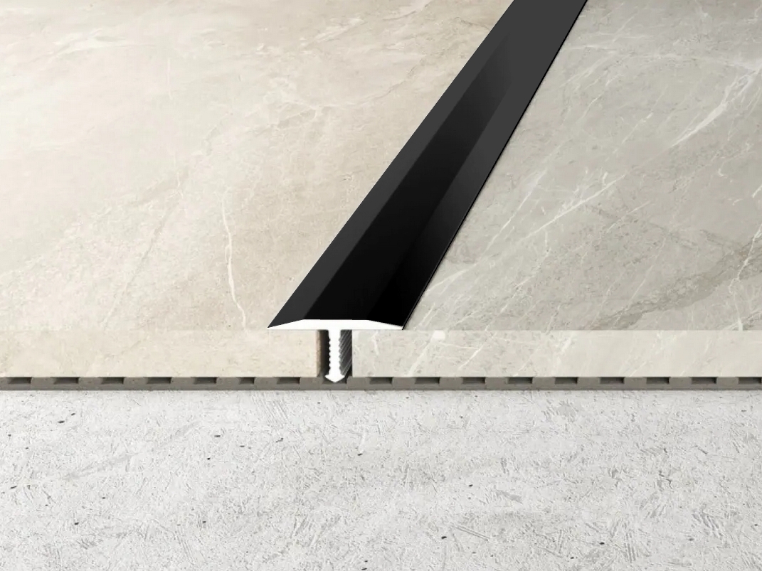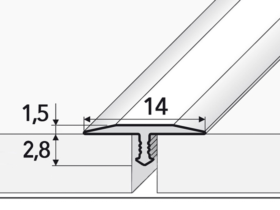 Hliníková přechodová T-lišta k dodatečnému překrytí úzkých spár a k napojení dvou krytin v rovině (např. vinyl/vinyl, laminát/laminát).