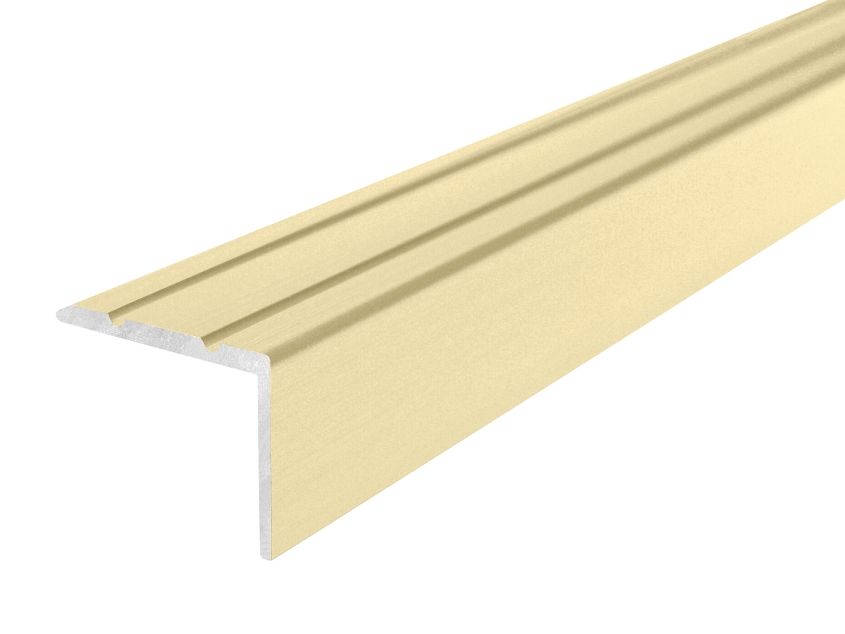 Schodová lišta Profilteam 25×20 mm v provedení Sahara E20 (eloxovaný hliník) slouží k ochraně hran a ukončení schodišťových stupňů.
