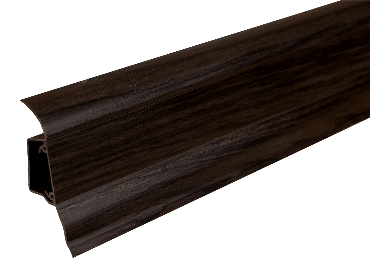 Soklová lišta Döllken SLK 50 W476 Wenge přináší elegantní tmavý dekor exotického dřeva do moderních interiérů. Profil z voděodolného PVC obsahuje odnímatelný kabelový kanál pro vedení nízkonapěťových kabelů (TV, data, audio). Díky pružným těsnicím hranám dokonale přilne ke stěně i podlaze. Rozměr lišty je výška 50 mm, šířka 25 mm, délka 2,5 m. K dispozici jsou tvarovky ve stejném dekoru – vnitřní a vnější roh, spojka, pravá a levá koncovka.
