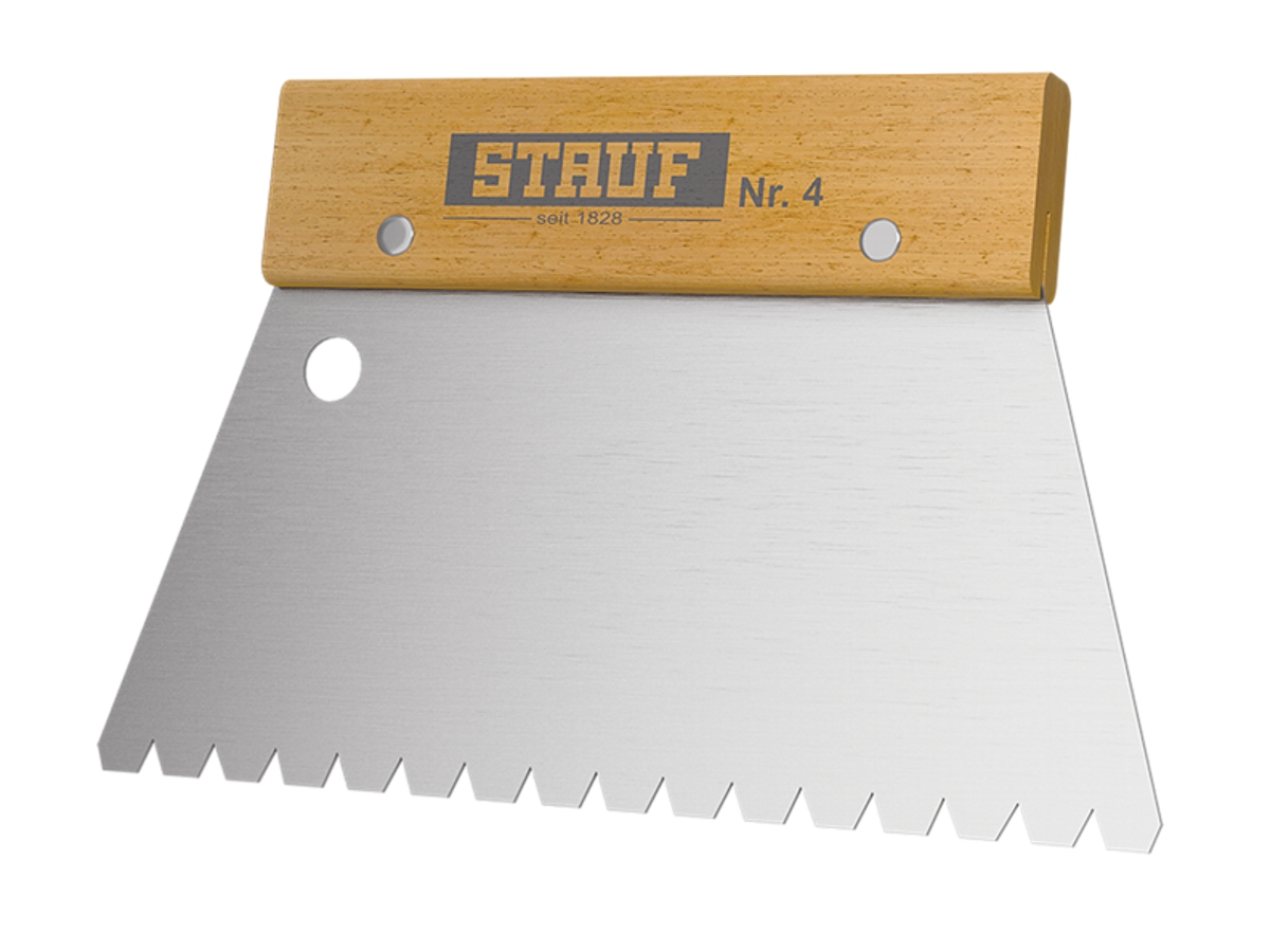 Zubová špachtle Nr. 4 (TKB B15) pro lepení třívrstvého dřeva, parket a masivního dřeva. Zub a/b/c = 6,5/5,5/7,0 mm. Art.-Nr. 160040. Kvalitní provedení STAUF. Rukojeť pevná z bukového dřeva pro přirozený úchop. Tělo litý hliník v jednom kuse s oblým profilem pro ergonomii.