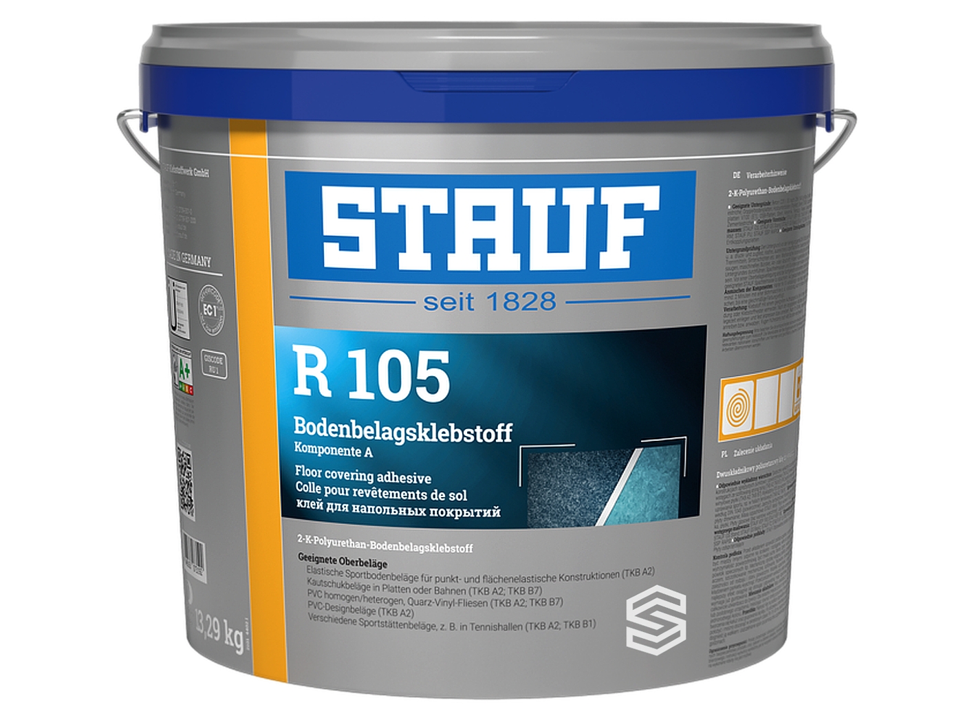 STAUF R 105 je dvousložkové (2K) polyuretanové lepidlo pro náročné instalace: PVC / LVT, guma, textil, sportovní podlahy a EPDM dráhy. Interiér i exteriér, voděodolné, bez smrštění, tvrdě elastické, EC1 PLUS (velmi nízké emise). Vhodné na cement/anhydrit, dřevo/OSB, sádrovlákno, kov, kámen, keramiku a vyrovnávací hmoty STAUF. Pot life ~30 min, otevřená doba ~50 min, pochozí 12–24 h.