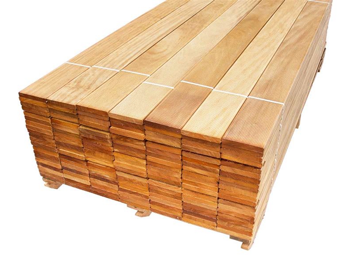 Hranoly z exotické dřeviny srovnatelné trvanlivosti nebo hliníkové profily; maximální osová vzdálenost pro profil 21 × 145 mm je cca 35–40 cm.