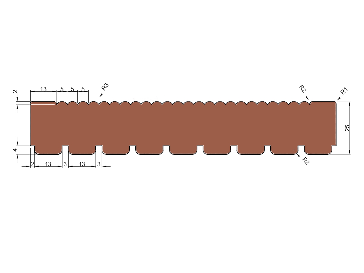 Každý profil terasového prkna má předem definovanou pohledovou stranu, ke které se vztahuje třídění a na kterou se při montáži díváte. U Merbau 25 × 145 mm je pohledová strana jemně drážkovaná. Použití druhé strany jako pohledové se nedoporučuje – může obsahovat znaky, které nejsou v třídění hodnoceny, a hůře odvádět vodu.