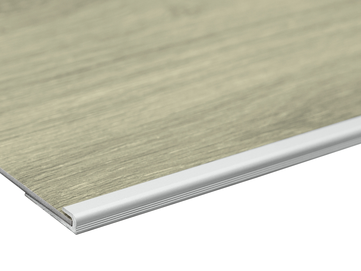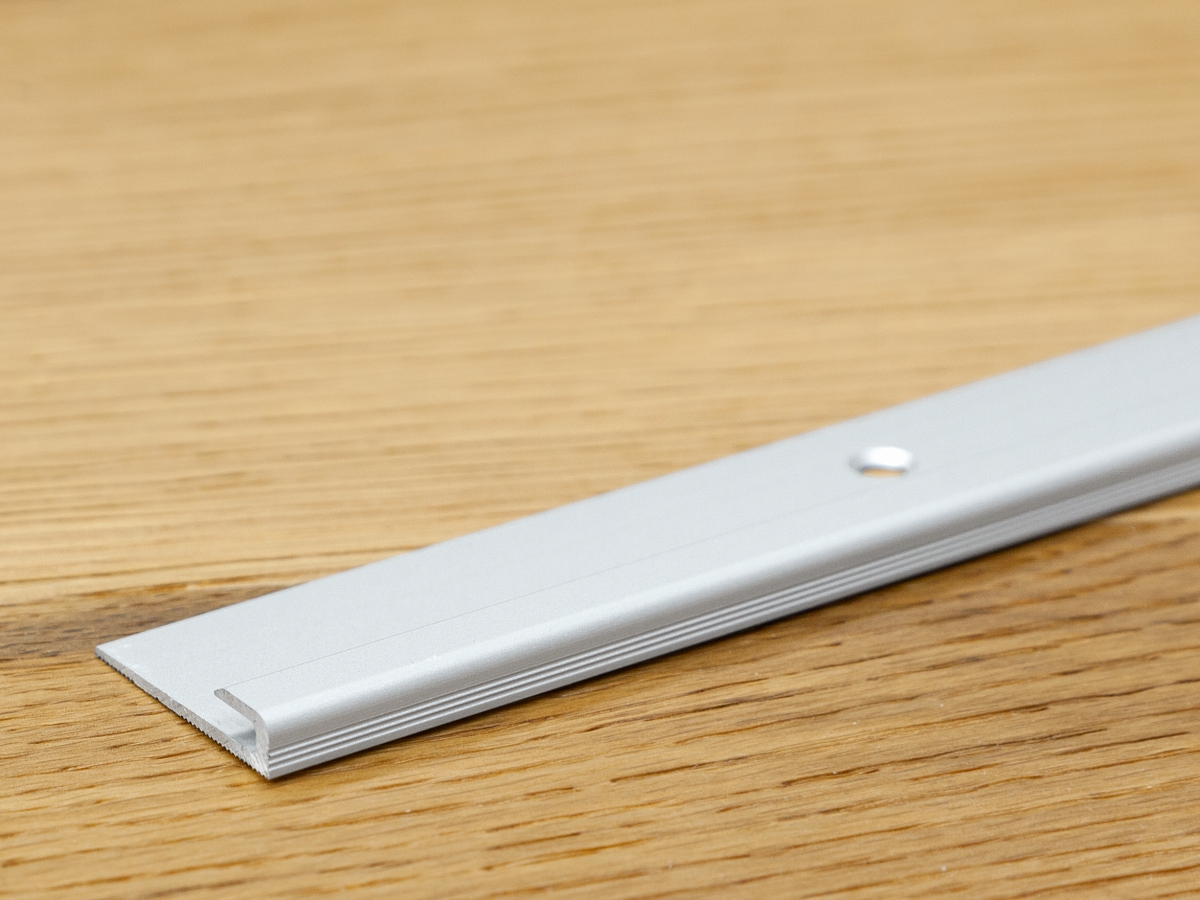 Hliníkový ukončovací profil Küberit 803 V pro zakončení lepených krytin do 7 mm v ploše i na hraně schodu. Profil je bez ozdobných drážek a zapuštěně vrtaný (versenkt gebohrt) – umožňuje montáž šrouby, případně lepení na rovný, čistý a nosný podklad. U tenčích krytin se doporučuje podložení kvůli eliminaci schodové hrany.
