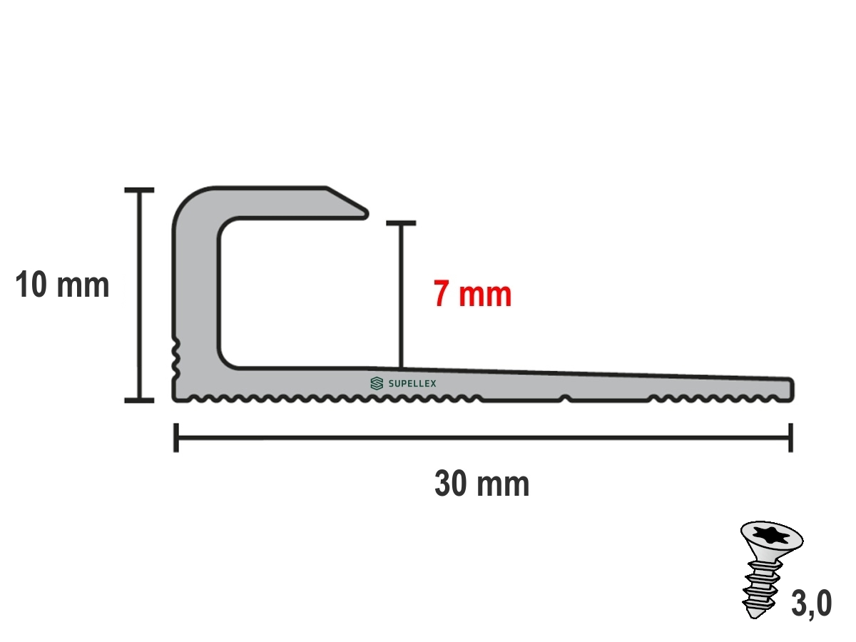Hliníková ukončovací lišta Küberit 803 V (Einschubprofil bez drážek, zapuštěně vrtaná) pro čisté zakončení PVC, vinylu a koberců do 7 mm. Rozměr 30×10 mm, délka 2500 mm, vnitřní rozměr 7 mm. Montáž šrouby Torx Ø 3,0 mm (vruty i hmoždinky v balení) a/nebo lepením na rovný a nosný podklad. Reakce na oheň A1.
