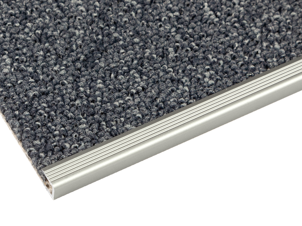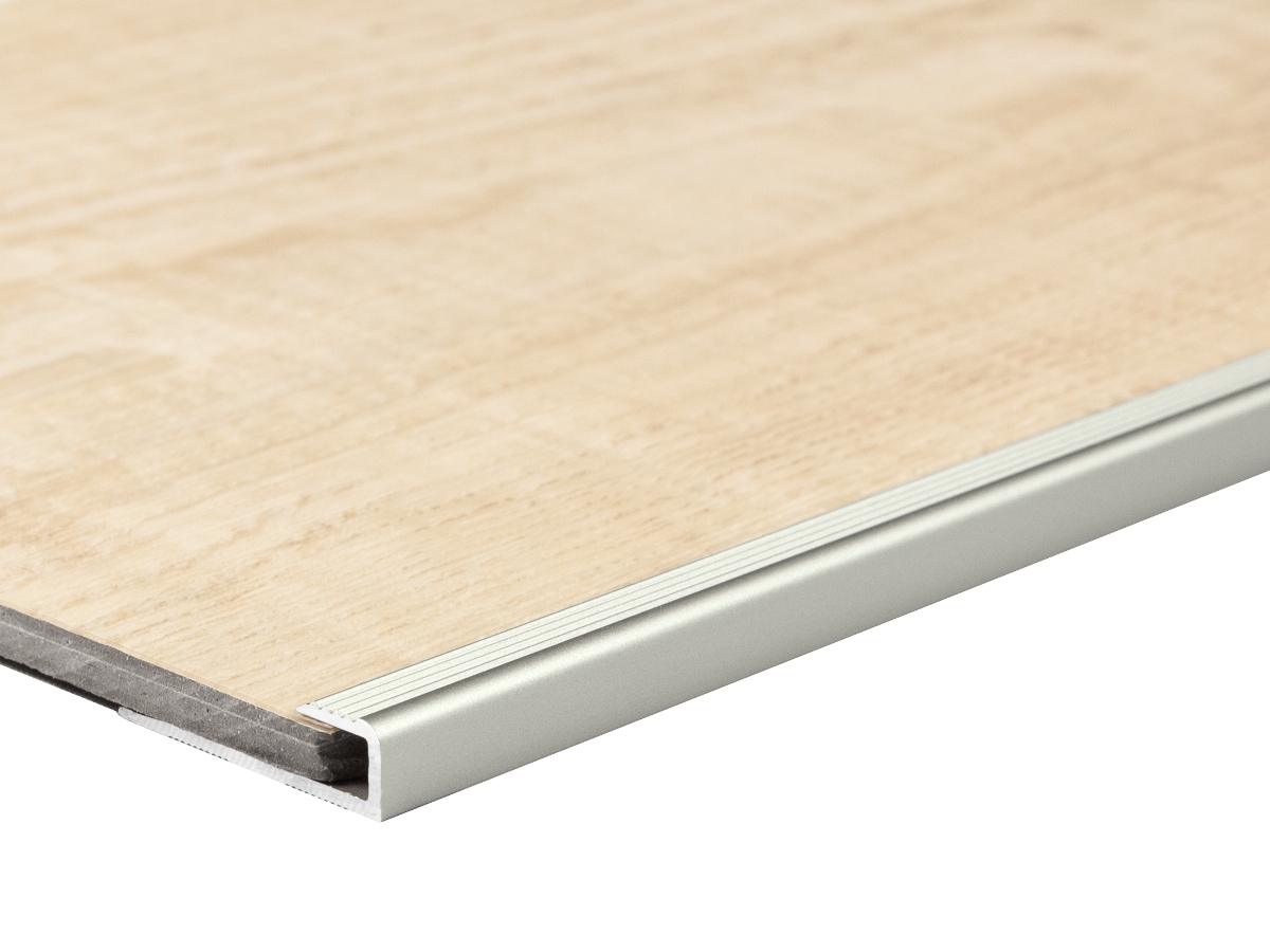 Hliníkový ukončovací profil Küberit 805 pro zakončení lepených krytin do 7 mm v ploše i na hraně schodu. Tato varianta je zapuštěně vrtaná pro montáž šrouby, alternativně je možná i lepená instalace na rovný, čistý a nosný podklad.