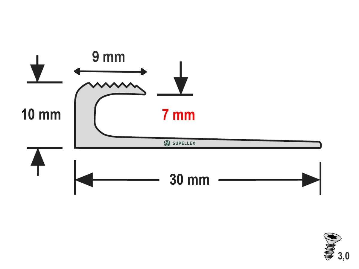 Hliníková ukončovací lišta Küberit 805 (zapuštěně vrtaná) pro čisté zakončení PVC, vinylu a koberců do 7 mm v ploše i na hraně schodu. Rozměr 30×10 mm, délka 2500 mm. Montáž šrouby Torx Ø 3,0 mm (vruty i hmoždinky jsou součástí dodávky) a/nebo lepením na rovný a nosný podklad. Povrch F2 – imitace nerezi (elox). Reakce na oheň A1.