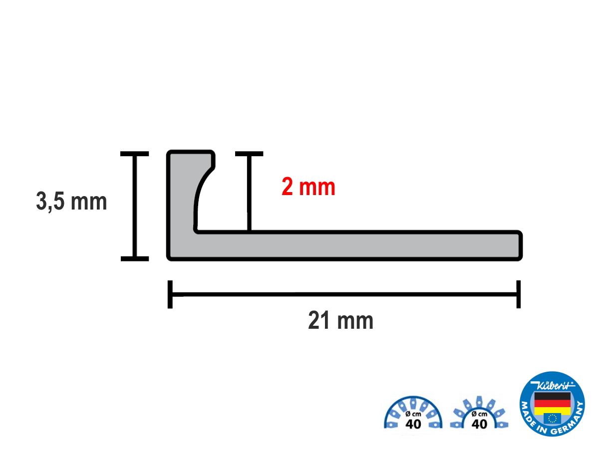 Küberit 299 G je přesný hliníkový L-profil pro čisté zakončení okraje pevných, elastických a textilních podlahovin v úrovni krytiny. Navržen pro krytiny do 2,0 mm, kdy se profil vkládá do lepidlového lůžka a krytina k němu přiléhá v rovině. Profil je určen pouze pro celoplošné lepení. Uzavřené double-K děrování s montážním otvorem zajišťuje mechanické zaklínění lepidla/spártovací hmoty a stabilitu spoje.