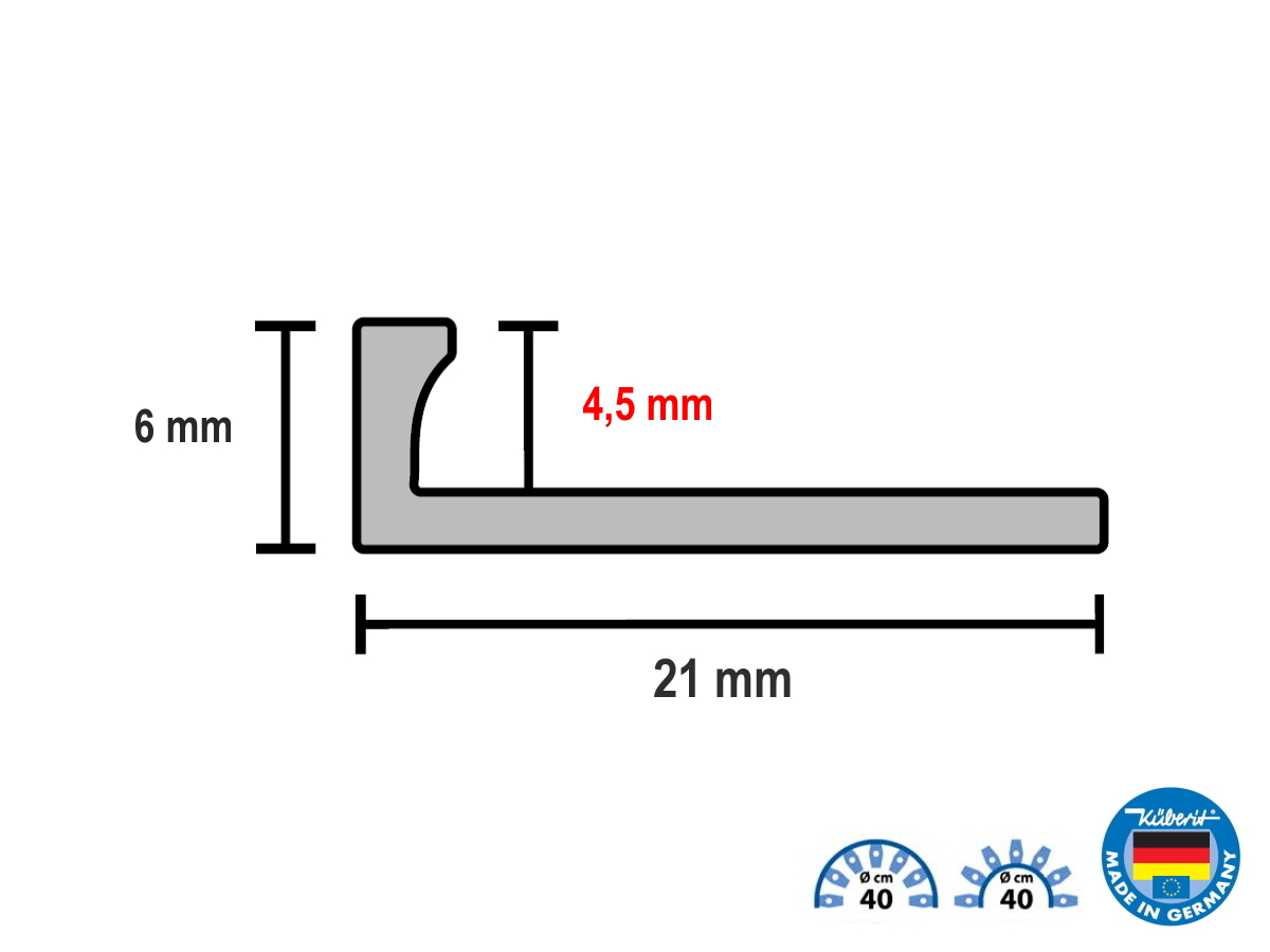 Küberit 302 G je ohýbatelný ukončovací L-profil pro přímou instalaci keramiky, elastických, textilních i tvrdých podlahovin do tloušťky 4,5 mm. Pouze při celoplošném lepení. Má uzavřené děrování double-K s montážním otvorem; délka profilu 2500 mm (k dispozici i 3000 mm), šířka 21 mm, viditelná hrana 2,0 mm. Povrch F4 – Stříbrná (elox); balení 6 × 2500 mm.