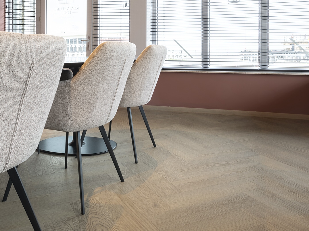 Charakter: světlý, vzdušný a uklidňující odstín; herringbone dodá jemný rytmus bez optického zahlcení.