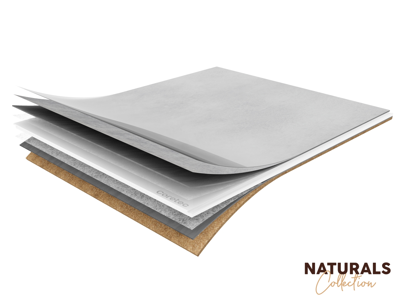 COREtec Naturals Tile+ V4 spojuje vzhled kamenné/keramické dlažby s benefity hybridního vinylu: rozměr 915 × 471 × 8 mm, sražení V4, stabilní jádro SOUND Core®, 0,55 mm nášlapná vrstva a integrovaný korek 1,5 mm pro teplý, tichý došlap. Konstrukce je 100 % voděodolná a zvládá i náročnější provoz (třída užití 23/33).