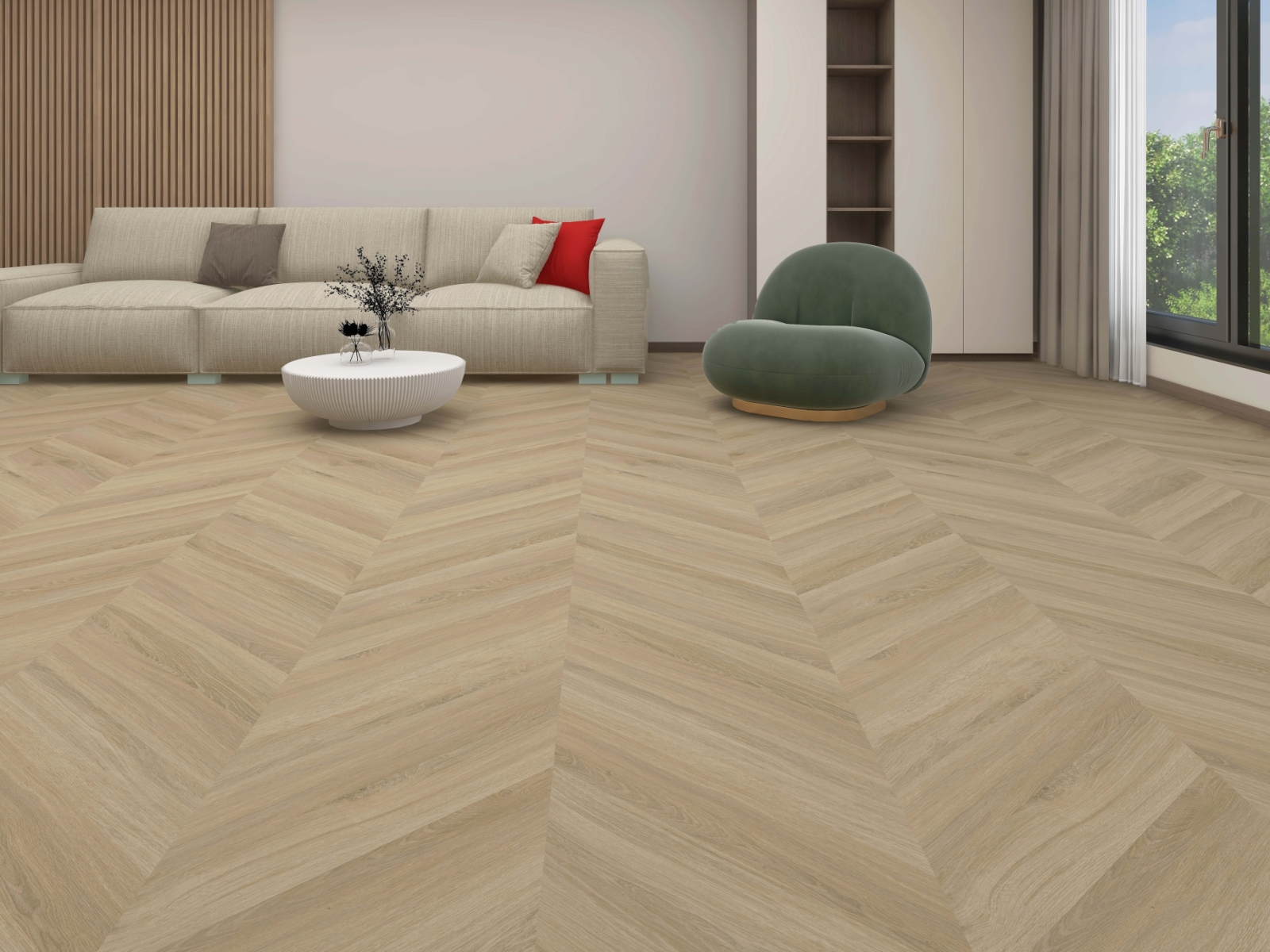 Almond Chevron S dobře funguje v interiérech, kde chceš zachovat světlý a kultivovaný dojem bez výrazného teplého nebo studeného posunu. Snadno se kombinuje s bílou, greige, smetanovou, světle šedou i s přírodními materiály. Hodí se jak do moderního bydlení, tak do střízlivě řešených komerčních prostor.