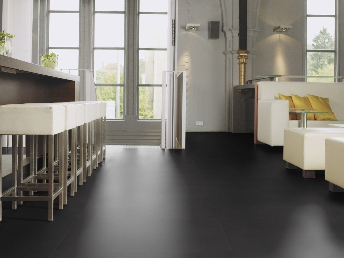 Řada wineo 800 tile přináší 0,55 mm nášlap s PU povrchem, bez ftalátů, určená i pro vyšší zátěž a prostory se zvýšenou vlhkostí. Formát Tile L (457 × 457 mm) s 4strannou zkosenou hranou vytváří elegantní kamenný/keramický efekt v jednotné černé. Lepený systém zajišťuje stabilní, tichou a hygienickou podlahu.