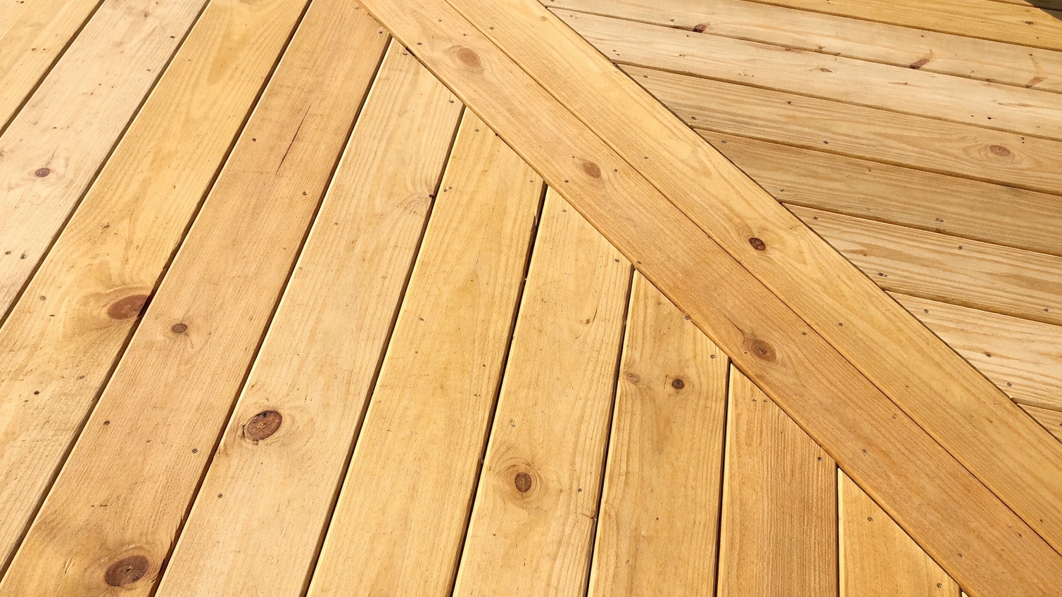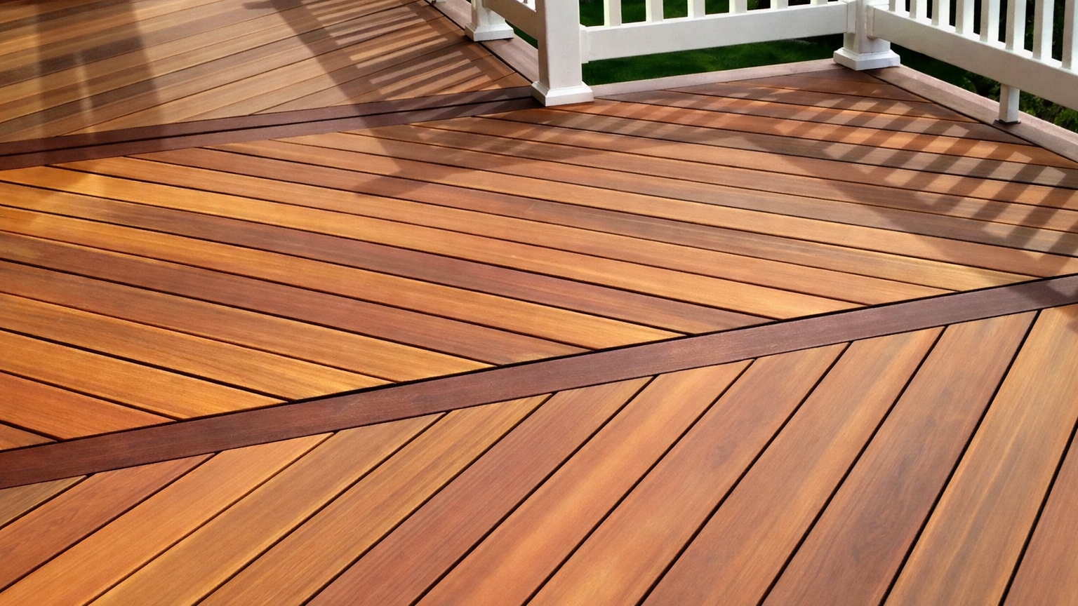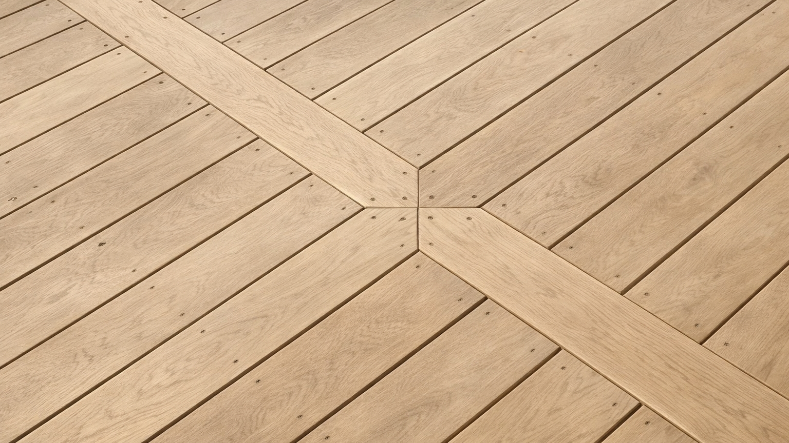 Prkna jsou položena pod úhlem (např. 45°) vůči domu nebo hlavní ose terasy. Tento vzor opticky zvětšuje prostor a dodává terase dynamický vzhled, ale je náročnější na přesnost úhlových řezů, přípravu roštu a přesné osové vytyčení vzoru.