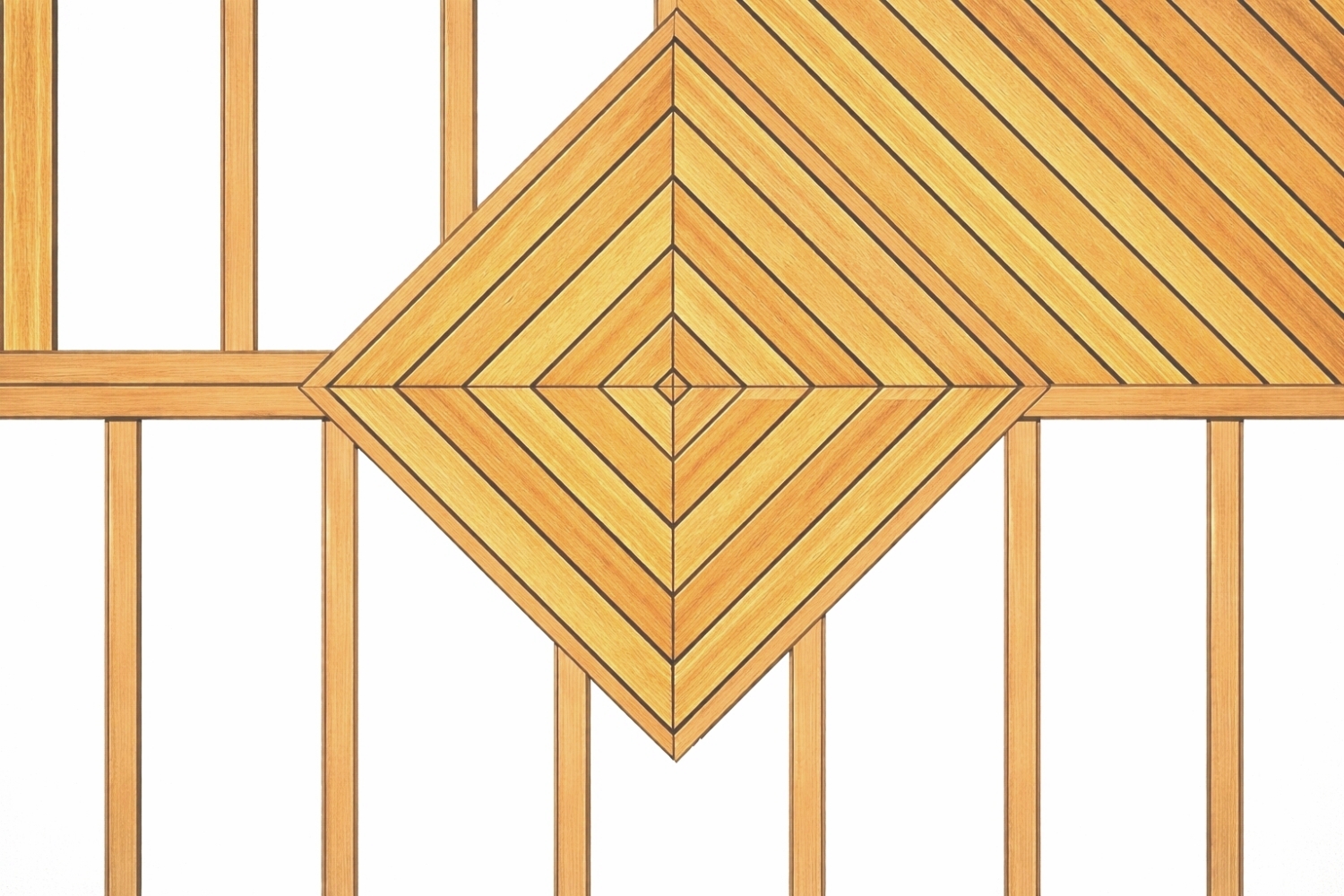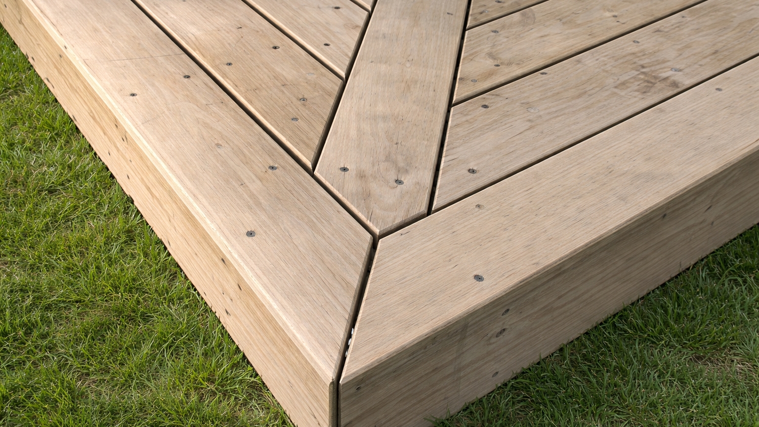 Prkna jsou sesazena v symetrickém V-vzoru, přičemž konce desek se stýkají v přesném úhlu. Tento vzor opticky zvětšuje prostor a dodává terase dynamický vzhled, ale vyžaduje více materiálu, přesné úhlové řezy a hustší nosnou konstrukci.